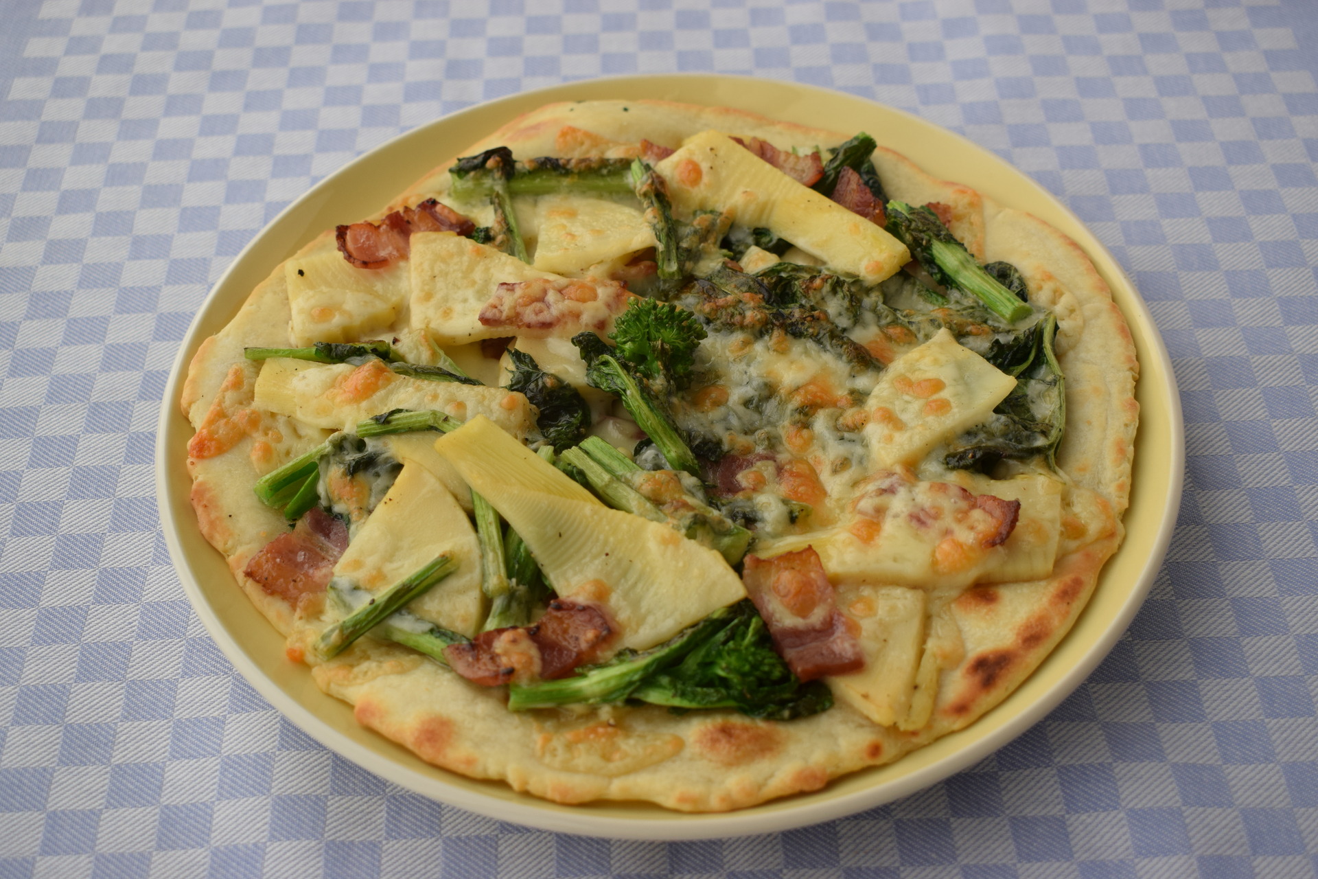 新タケノコ小½本・80㌘、菜花60㌘、ベーコン2枚、オリーブ油小さじ1、A(薄力粉100㌘、強力粉50㌘、塩・ベーキングパウダー各小さじ½)、B(オリーブ油大さじ1、牛乳約100㍉㍑)、マヨネーズ大さじ½、ピザ用チーズ40㌘、強力粉少々