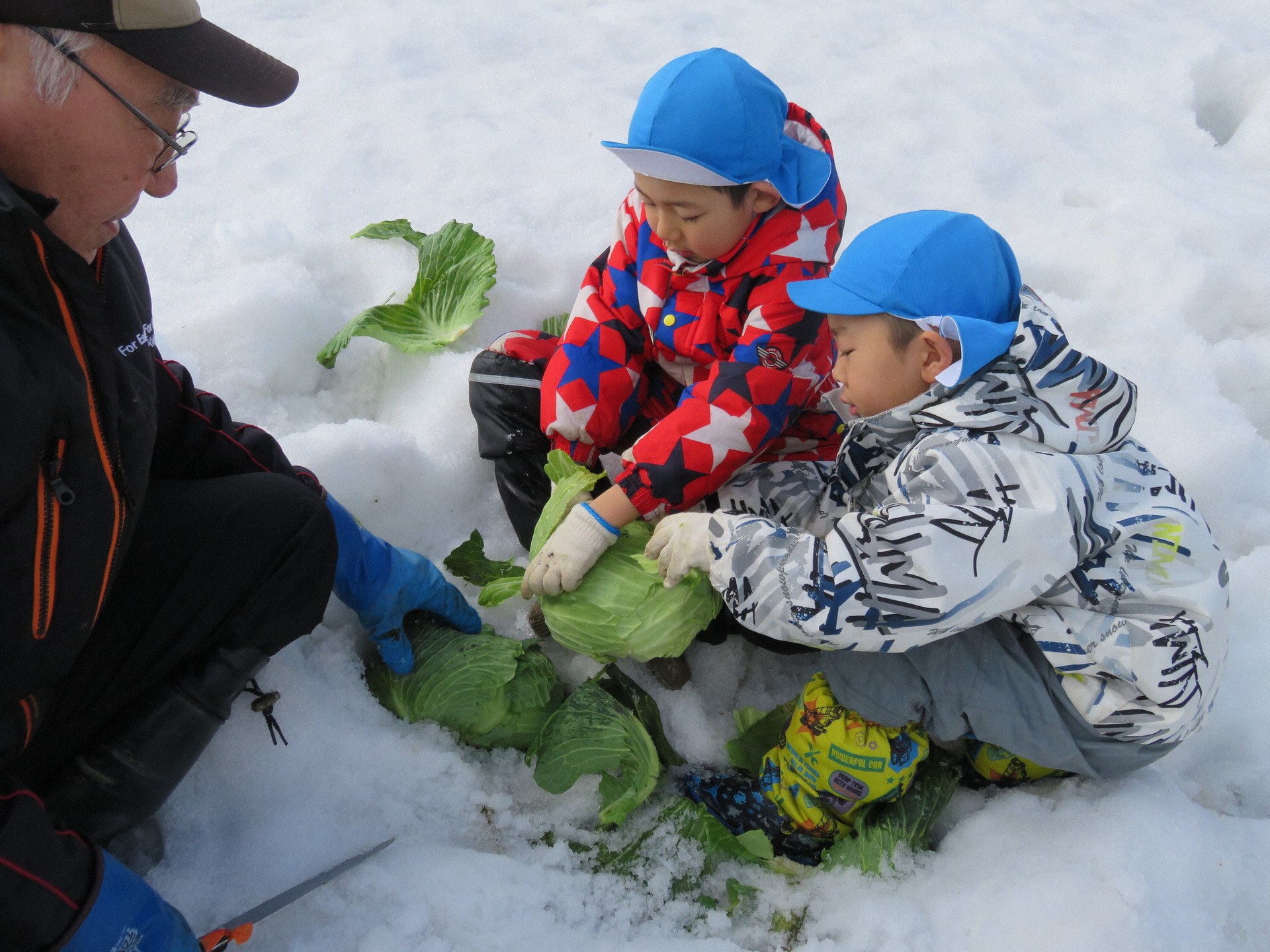 由利本荘市東由利地域で3月6日、雪中キャベツ収穫体験が行われた。主催したのは、同地域にあるグリーンツーリズム研究会(金子拓雄会長)で、地元の保育園「えみの森」の園児たちが参加し、雪の中に埋まったキャベツを一つ一つ掘り出しながら歓声を上げて