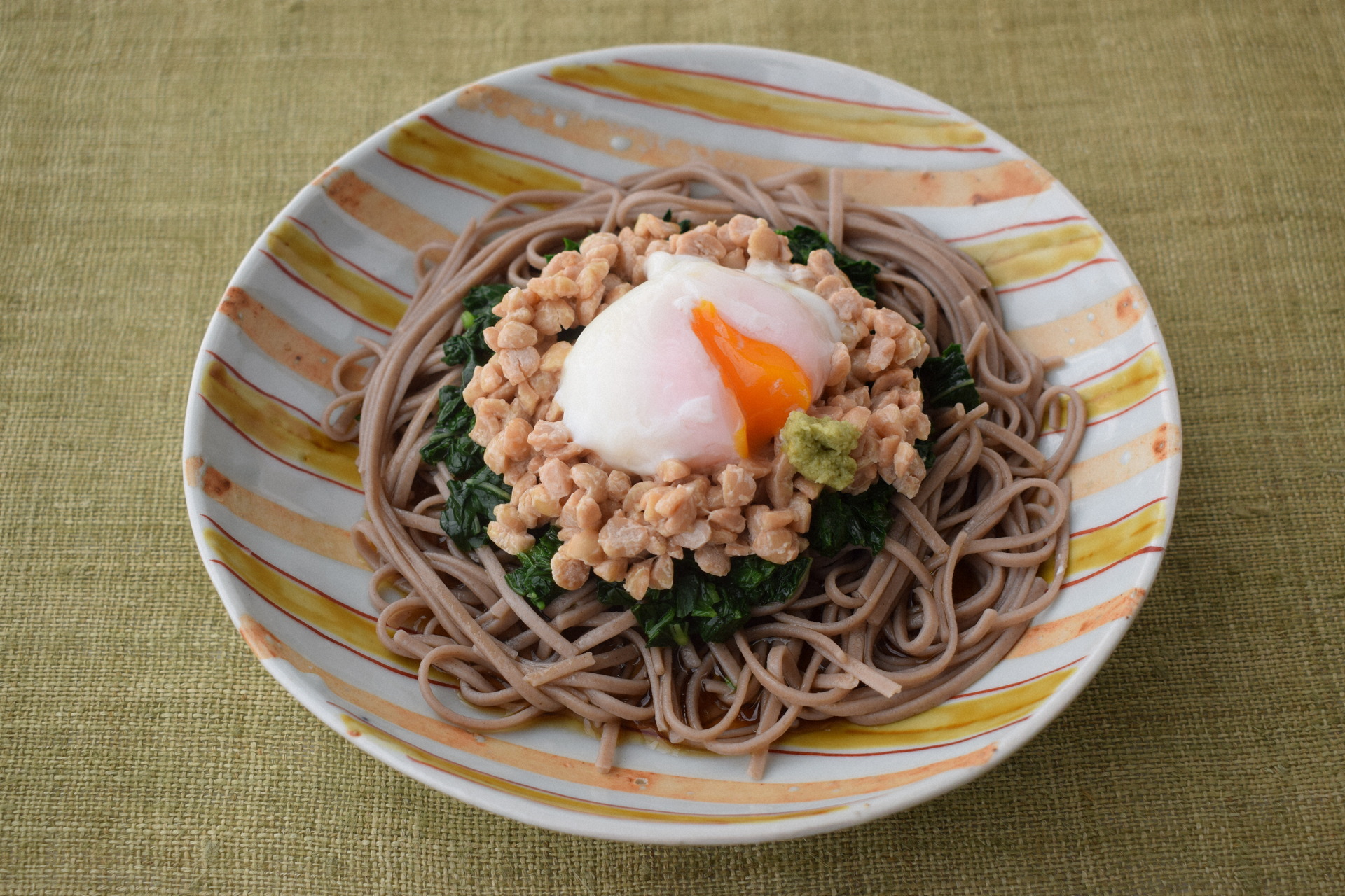 ◆材料(4人分) 乾そば300㌘、モロヘイヤ2束200㌘、塩適量、ひきわり納豆4パック 160㌘、温泉卵4個、A(3倍濃縮めんつゆ75㍉㍑、冷水150㍉㍑、オリーブ油大さじ1)
