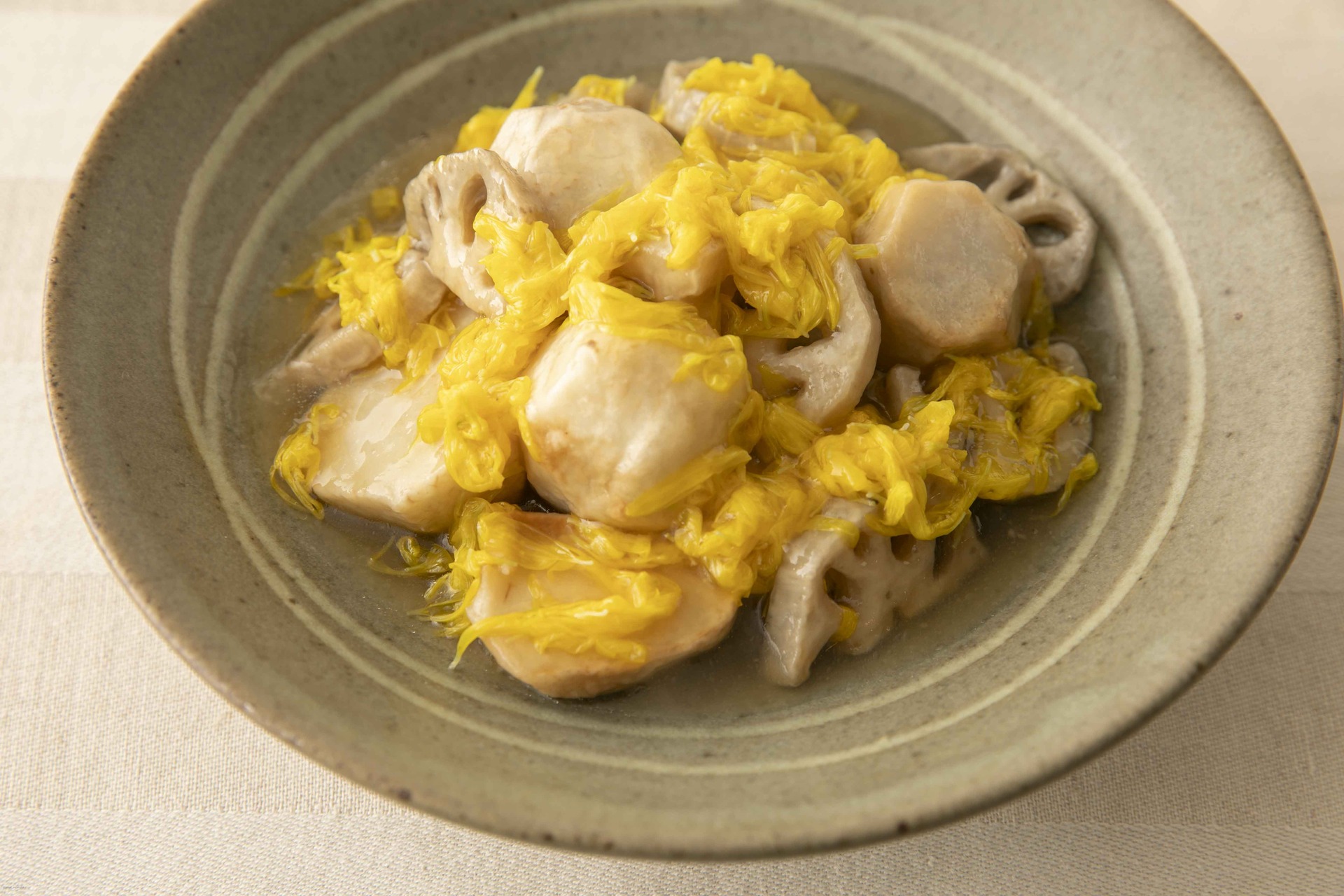 ◆材料(4人分) 里芋300㌘、レンコン150㌘、菊花6個20㌘、片栗粉大さじ1と½、A(だし汁300㍉㍑、薄口しょうゆ・みりん各大さじ1、塩少々)、揚げ油