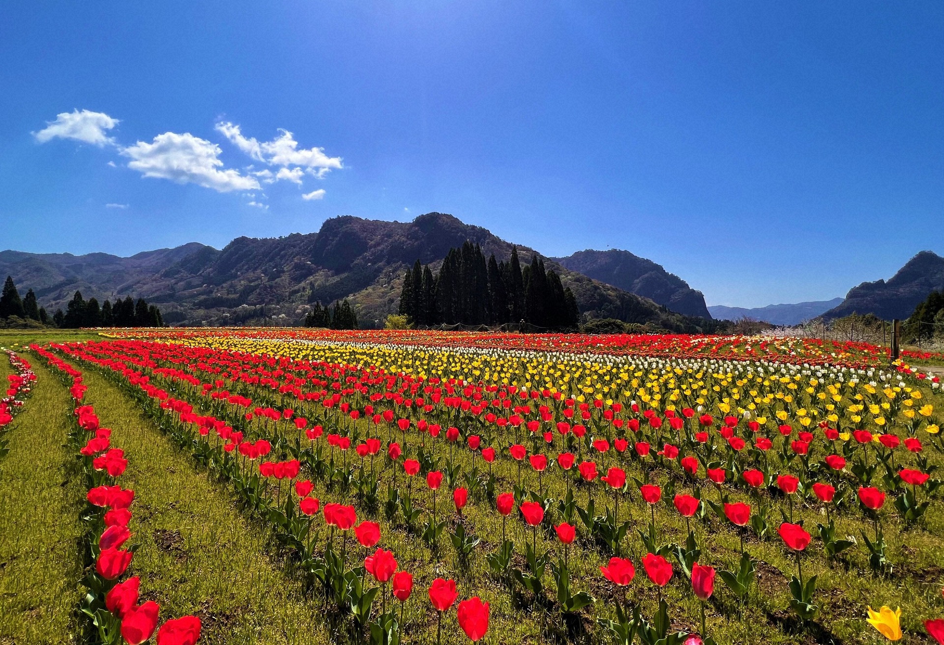 日之影町の中心部から車で30分ほど走った先にある中川地区。毎年4月になると30㌃の水田に約3万5千本のチューリップが鮮やかに咲き誇る。8世帯13人が暮らす同地区では「チューリップの里づくり」の取り組みにより年々関係人口を増やしている。